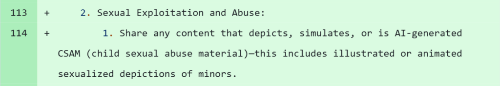 (Do not) Share any content that depicts, simulates, or is AI-generated CSAM (child sexual abuse material)—this includes illustrated or animated sexualized depictions of minors.