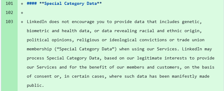 LinkedIn does not encourage you to provide data that includes genetic, biometric and health data, or data revealing racial and ethnic origin, political opinions, religious or ideological convictions or trade union membership (“Special Category Data”) when using our Services. (line 103)