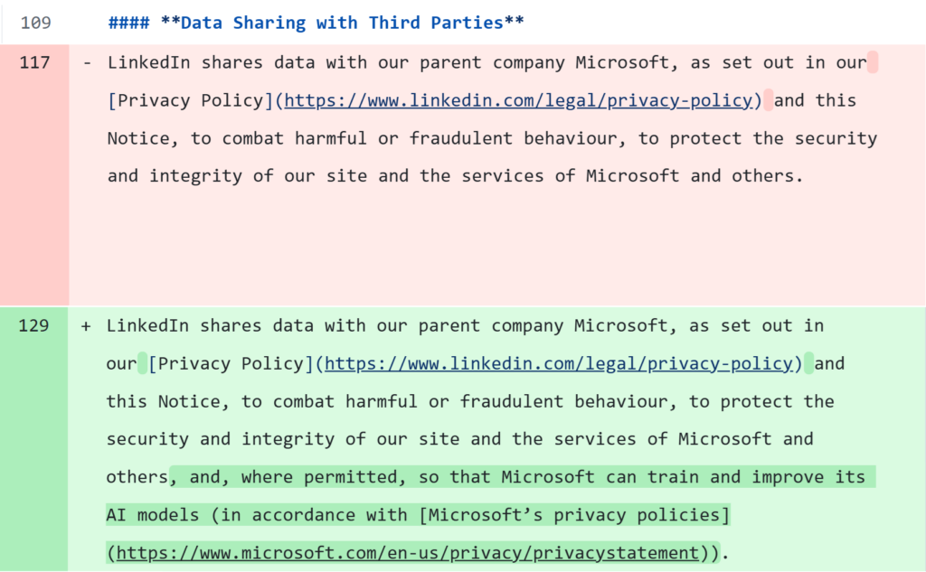 LinkedIn shares data with our parent company Microsoft […], so that Microsoft can train and improve its AI models (line 129)
