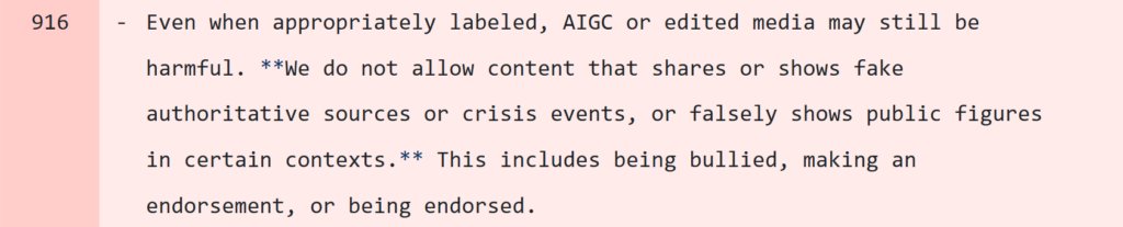 Even when appropriately labeled, AIGC or edited media may still be harmful. We do not allow content that shares or shows fake authoritative sources or crisis events, or falsely shows public figures in certain contexts. This includes being bullied, making an endorsement, or being endorsed. (916)