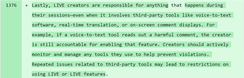 […] LIVE creators are responsible for anything that happens during their sessions—even when it involves third-party tools like voice-to-text software, real-time translation, or on-screen comment displays. (1376)
