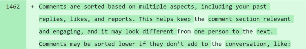 Comments are sorted based on multiple aspects, including your past replies, likes, and reports. […] Comments may be sorted lower if they don’t add to the conversation (1462)