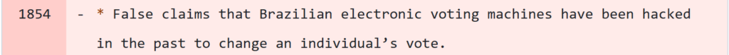 False claims that Brazilian electronic voting machines have been hacked in the past to change an individual’s vote. (1854)