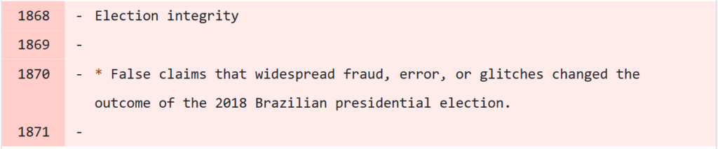 False claims that widespread fraud, error, or glitches changed the outcome of the 2018 Brazilian presidential election. (1870)