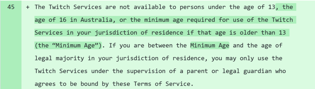 “The Twitch Services are not available to persons under the age of 13, the age of 16 in Australia, or the minimum age required for use of the Twitch Services in your jurisdiction of residence if that age is older than 13 (the “Minimum Age”).” (Line 45)